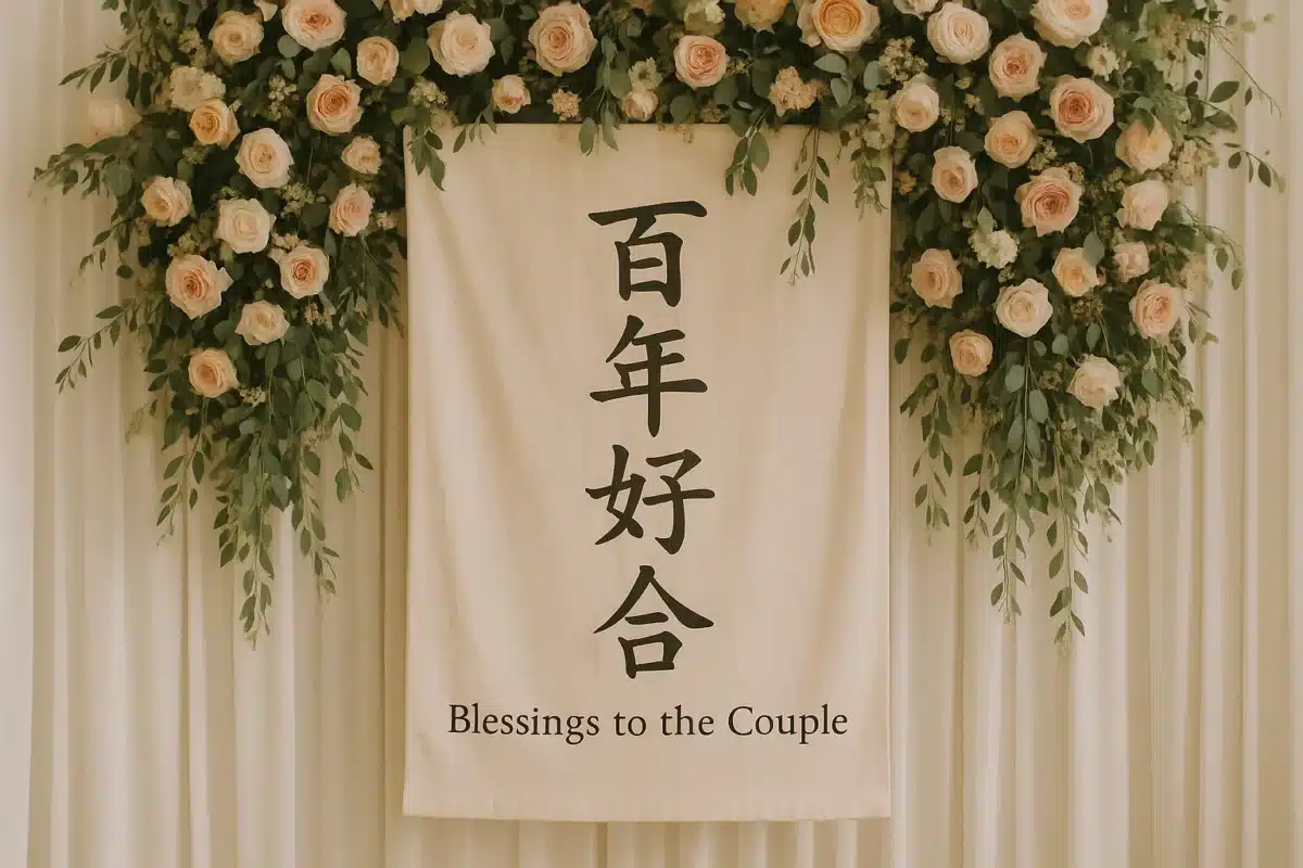 It’s a traditional and respectful Japanese congratulatory message commonly seen at weddings, printed on banners, signs, or floral boards.